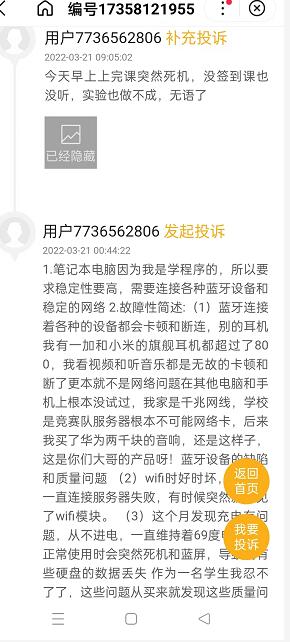 今年3月底,有消費者在黑貓投訴平臺投訴,其購買的榮耀筆記本電腦藍牙卡頓、機身發熱、死機、電池有問題。