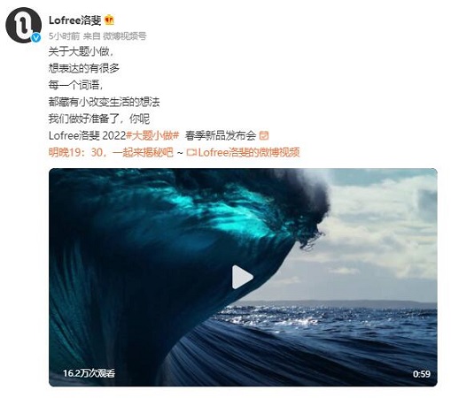 家電消費網5月17日訊    今天,洛斐在官方微博發布了明天即將發布的2022年春季新品發布的預熱視頻。截止家電消費網發稿止,該預熱視頻的點擊率已經超過16萬人次。