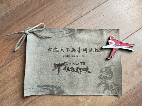 打開包裝盒,內有一張牛皮做成的英雄帖,寫有“今邀天下英豪同見證,vivo T2性能真功夫”,暗示vivo T2性能相當牛。
