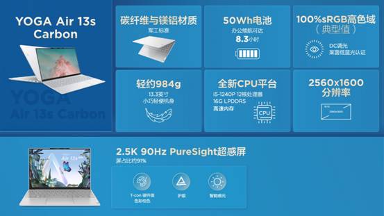 “輕盈本”YOGA Air 13s Carbon外觀如珠似寶,輕盈優雅,機身采用碳纖維和鋁鎂等高端材質,輕約984克,十分小巧。搭載最新第十二代酷睿處理器,配備2.5K 90Hz PURESIGHT超感屏,續航長達8.3小時,身量輕盈卻性能強大。
