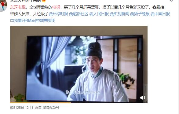日前,有南京消費者投訴稱,其購買的東芝電視觀看幾個月,屏幕就變成藍色,成為藍屏,找廠家換了一臺新電視后,使用幾個月后又沒有色彩了。“一半黑白,一半彩色,”氣憤的消費者拍了小視頻發(fā)到微博上,讓更多消費者看到東芝電視的質量問題。該消費者還表示,找東芝電視客服推諉,找維修人員也推諉,“東芝電視,全世界最爛的電視。”該消費者還@了央視新聞、環(huán)球時報、人民日報、中國日報等媒體。