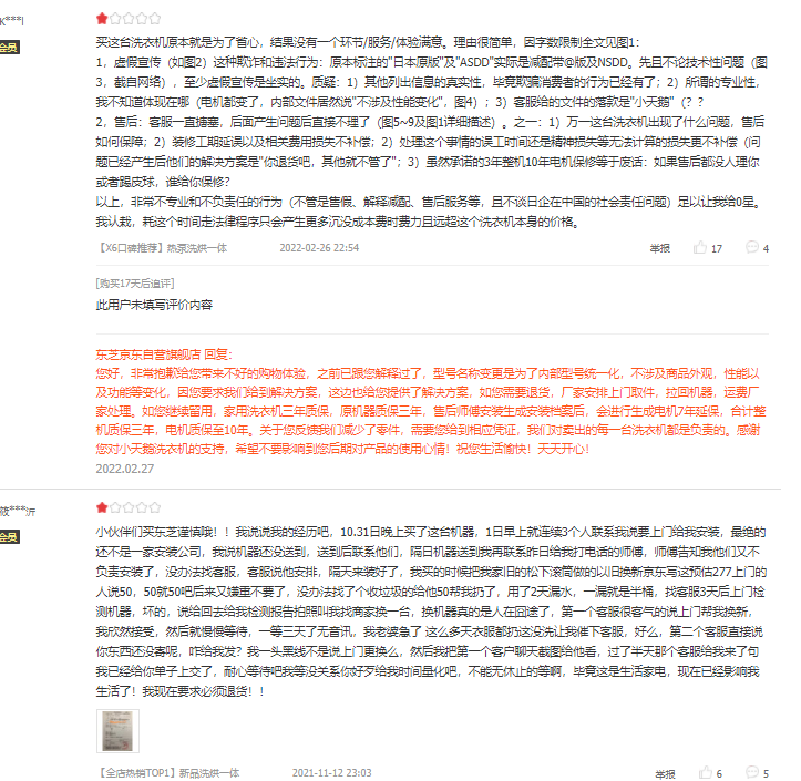 東芝洗衣機則被消費者曝光出是美的旗下小天鵝生產。日前,有消費者吐槽稱,在京東東芝自營旗艦店花1.6499萬元購買的東芝洗衣機X6,到家拆開包裝才發(fā)現(xiàn)原標注的"日本原版"及"ASDD"實際是減配帶@版及NSDD,電機都變了,內部文件居然說"不涉及性能變化”,該消費者認為東芝洗衣機涉嫌虛假宣傳,向客服投訴后,發(fā)現(xiàn)給其回復的文件落款是美的集團旗下"小天鵝"品牌。(杜佳)