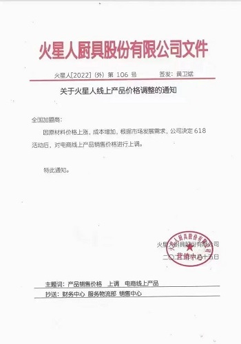 據了解,6月15日,由黃衛斌簽發、署名火星人廚具股份有限公司的“火星人線上產品價格調整”的通知,在不少家電零售商和社交平臺擴散,但這份漲價通知中并未說明調整價格的時間及具體漲價幅度。