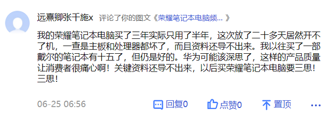 榮耀筆記本電腦開不了機資料導不出來 消費者:榮耀產品質量讓人痛心