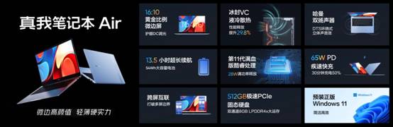 真我筆記本Air電腦采用14.9mm超輕薄全金屬機身設計,14英寸16:10黃金比例微邊屏,4.9mm超窄邊框;搭載第 11 代滿血版酷睿處理器,配合冰封VC液冷散熱技術,性能釋放更加強勁,可以滿足用戶學習、辦公和娛樂等多場景的使用需求。