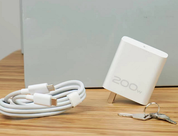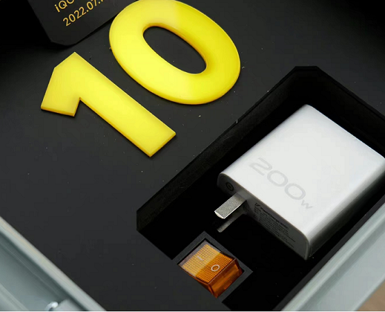 打開小變電箱,看到里面有一個200W的快充頭和線材。200W充電頭體積相較于120快充并沒有大了多少,這也許是120W+充電頭中體積中最小的。消息稱僅12分鐘即可從0充到100%。此外,變電箱內(nèi)還有一個開關(guān),可以控制橙色“10”明暗。