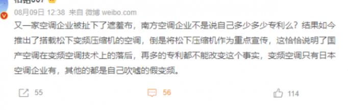 該業內人士稱:“又一家空調企業被扯下了遮羞布,南方空調企業不是說自己多少多少專利么?結果如今推出了搭載松下變頻壓縮機的空調,倒是將松下壓縮機作為重點宣傳,這恰恰說明了國產空調在變頻空調技術上的落后,再多的專利都不能改變這個事實,變頻空調只有日本空調企業有,其他的都是自己吹噓的假變頻。”