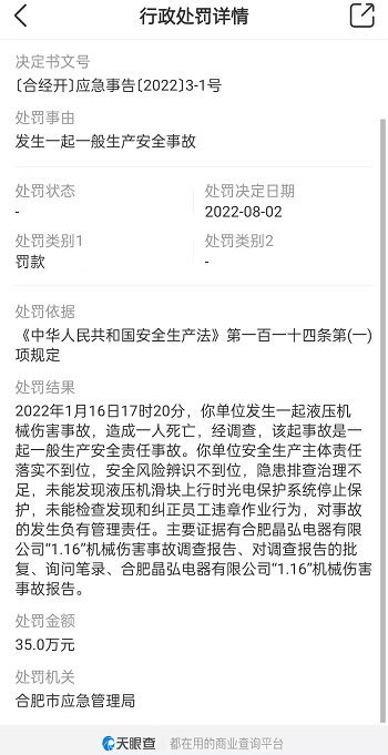 合肥市應急管理局行政處罰決定書(﹝合經開﹞應急事告﹝2022﹞3-1號)顯示,今年1月16日17時20分,合肥晶弘電器有限公司發生一起液壓機械傷害事故,造成一人死亡,經調查,該起事故是一起一般生產安全責任事故。該單位安全生產主體責任落實不到位,安全風險辨識不到位,隱患排查治理不足,未能發現液壓機滑塊上行時光電保護系統停止保護,未能檢查發現和糾正員工違章作業行為,對事故的發生負有管理責任。