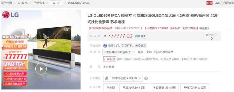 家電消費網9月18日訊 原價89萬的LG65寸OLED電視在京東降價十多萬,預售價為77.7萬。但是,京東頁面顯示,如今預定,該電視需要11月才能發貨。