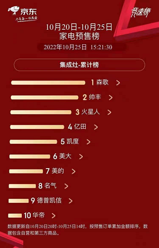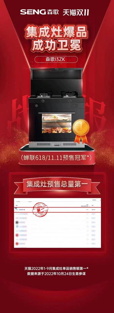 導讀:  家電消費網10月25日訊 昨日晚間8點,京東、天貓等電商平臺正式啟動雙十一大促。我國集成灶領軍品牌森歌斬獲京東、天貓雙11預售第一。其中,森歌推出的i3zk蒸烤消集成灶以其出色的品質與設計,更是今年蟬聯6