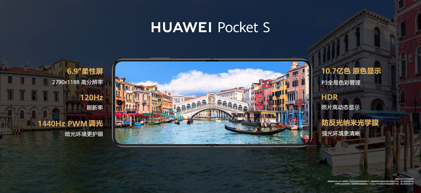 華為Pocket S打開(kāi)后為6.9英寸沉浸大屏,21:9出色觀影比例,帶來(lái) “劇場(chǎng)式”的沉浸體驗(yàn)。配合442ppi、10.7億色和P3廣色域色彩管理,更真實(shí)還原色彩,顯示更細(xì)膩。屏幕支持120Hz刷新率和300Hz觸控采樣率,顯示流暢、觸控精準(zhǔn);1440Hz 高頻PWM調(diào)光,暗光環(huán)境更護(hù)眼。華為Pocket S還支持HDR Vivid視頻顯示,色彩及層次更豐富,明暗對(duì)比更強(qiáng),為用戶帶來(lái)真實(shí)的臨場(chǎng)感。同時(shí)還采用了防反光納米光學(xué)膜,陽(yáng)光下也清晰。