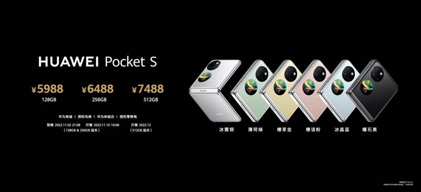 華為Pocket S 128GB售價(jià)5988元;256GB售價(jià)6488元;將于今晚21:08在華為商城、各大授權(quán)電商、華為體驗(yàn)店、授權(quán)零售商開(kāi)啟預(yù)售,11月10日10:08正式開(kāi)售。華為Pocket S 512GB售價(jià)7488元,將于2022年12月正式開(kāi)售。(溫麗雅)