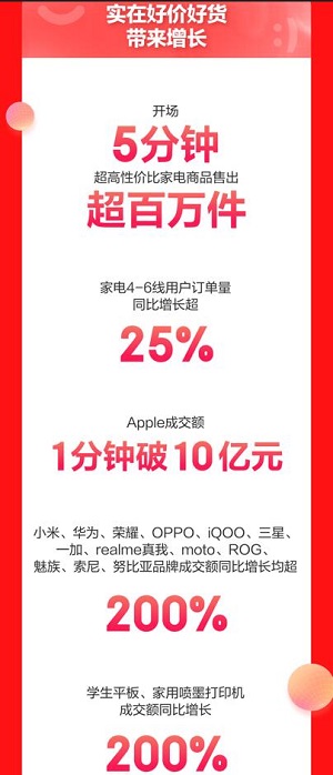 開場10分鐘,手機通訊品類發放補貼超10億元,小米、華為、榮耀、OPPO、iQOO、三星、一加、realme真我、moto、ROG、魅族、索尼、努比亞等品牌成交額均同比增長超200%。全面的服務進一步激發消費者“換機”需求,手機以舊換新的用戶量同比增長超3倍,“180天只換不修”“30天價保”手機保障服務產品覆蓋率超90%。