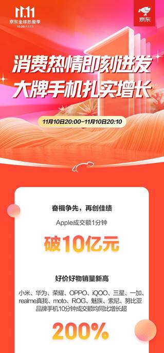 家電消費網11月10日訊 今日晚8點,京東11.11全球熱愛季迎來巔峰高潮時刻。京東數據顯示:Apple成交額1分鐘破10億元。小米、華為、榮耀、OPPO、iQOO、三星、一加、realme真我、moto、ROG、魅族、索尼、努比亞品牌手機10分鐘成交額均同比增長超200%的戰績。