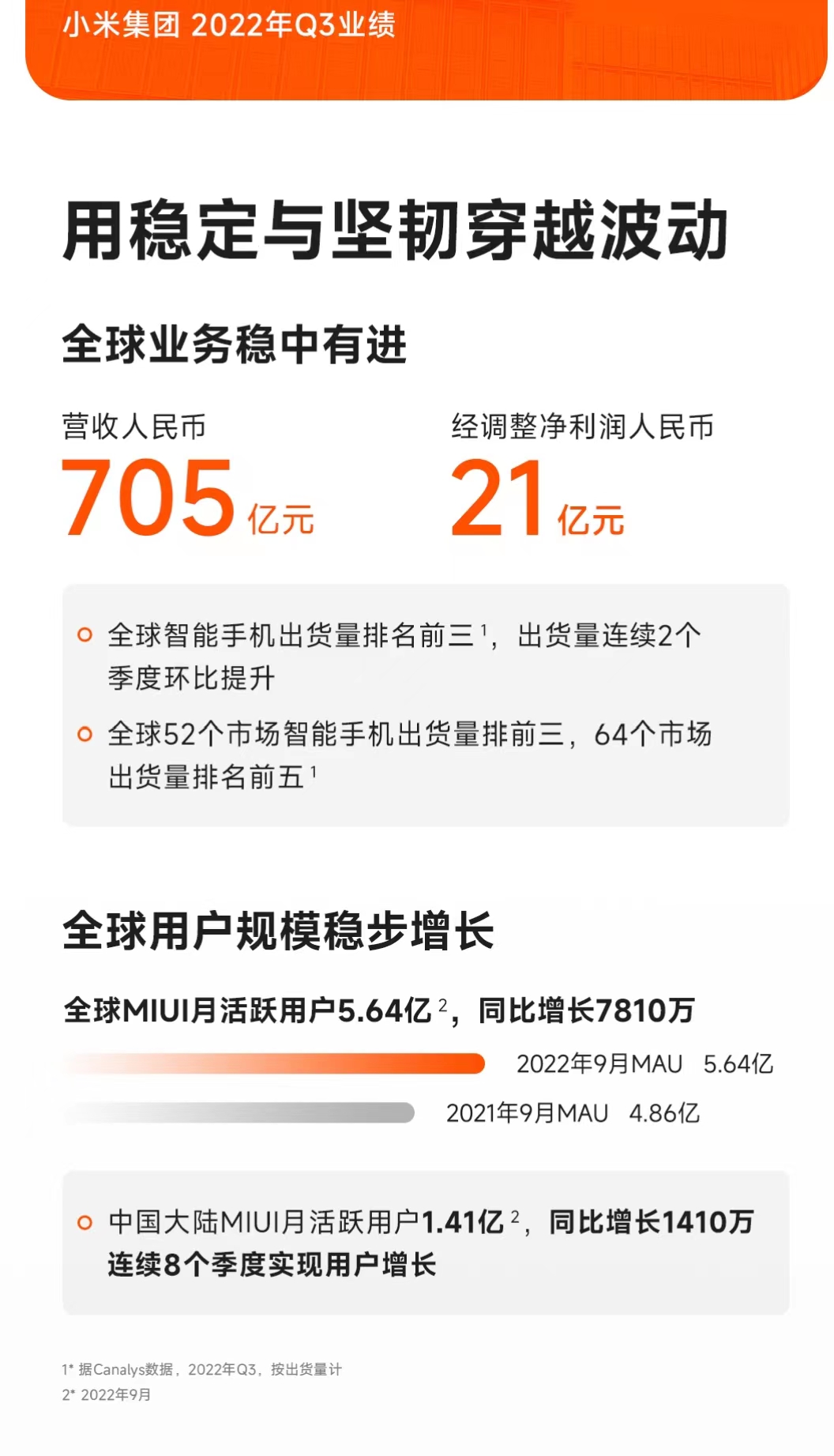 盡管外部環境復雜多變,小米全球各項業務穩健運營,業績環比改善,且穩中有進。商業模式展示出強勁的韌性。