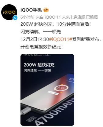 iQOO 11宣布搭載200W超快閃充 稱手機(jī)10分鐘充滿