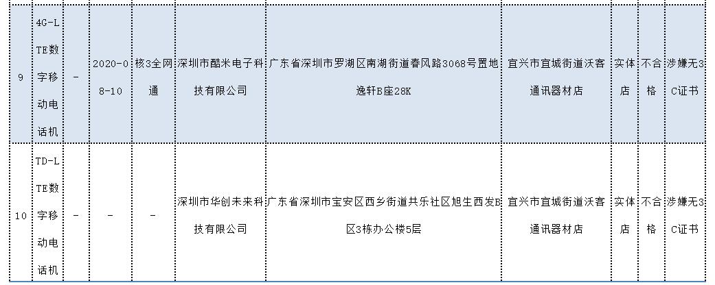 其中,標稱深圳市酷米電子科技有限公司生產(chǎn)的4G-LTE數(shù)字移動電話機涉嫌無3C證書,被查不合格。標稱深圳市華創(chuàng)未來科技有限公司生產(chǎn)的TD-LTE數(shù)字移動電話機涉嫌無3C證書,被查不合格。