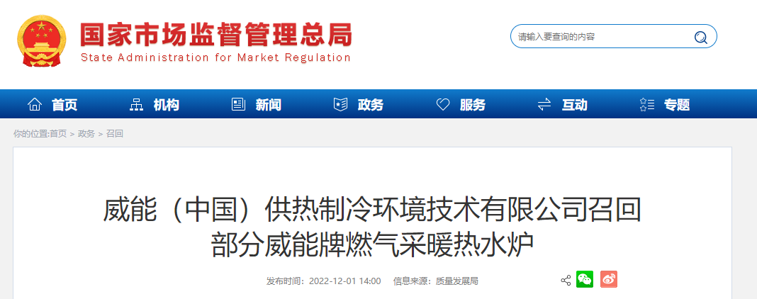 家電消費網12月4日訊     昨天,威能(中國)供熱制冷環境技術有限公司向國家市場監督管理總局報告了主動召回計劃,即日起,召回2021年12月31日前安裝完成的部分威能牌燃氣采暖熱水爐產品,涉及數量483,000件。