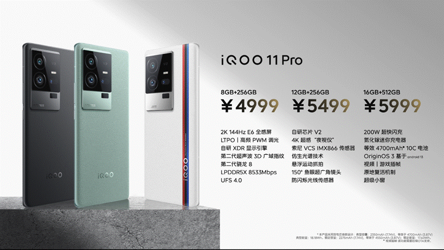 iQOO 11 Pro共有3個版本。其中,8+256版本售價4999元;12+256版本售價5499元;16+512版本售價5999元;預售和首銷期內購機,線上最高享受24期免息,購機用戶限時加享半年延保。