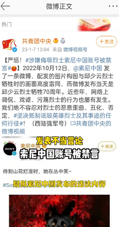 據北京日報報道,2022年10月12日,索尼中國官方微博發了一條微博,內容是“待到山花爛漫時,她在叢中笑~”。偉人的這句詩,是用冰雪襯托風骨錚錚的梅花,以梅花的品質、梅花的形象象征中國共產黨人在艱難環境下克服一切困難的不屈意志。然而索尼中國微博配發的圖片,卻透射著十足的惡意,圖里是一片紅色的花簇,而在花簇正中央的地方放了一個狗頭。而當天是邱少云烈士犧牲70周年,其圖片構圖與邱少云烈士犧牲時的畫面高度雷同。我們相信,這樣別有用心的設計絕非巧合。
