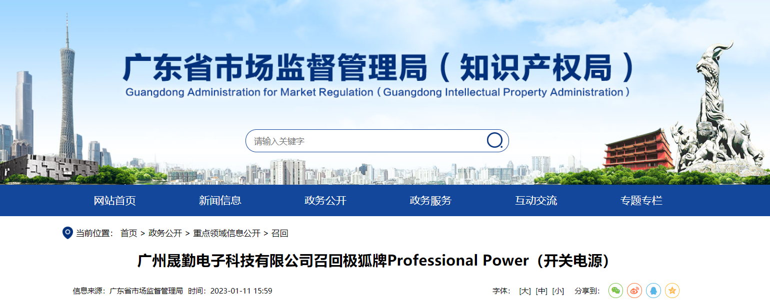 家電消費網1月12日訊 昨天,廣東省市場監管局網站發布消息,廣州晟勤電子科技有限公司主動向廣東省市場監督管理局報告了召回計劃,將自即日起,召回2021年12月至2022年3月期間制造的極狐牌刀客450型號Professional Power(開關電源),涉及數量為50個。