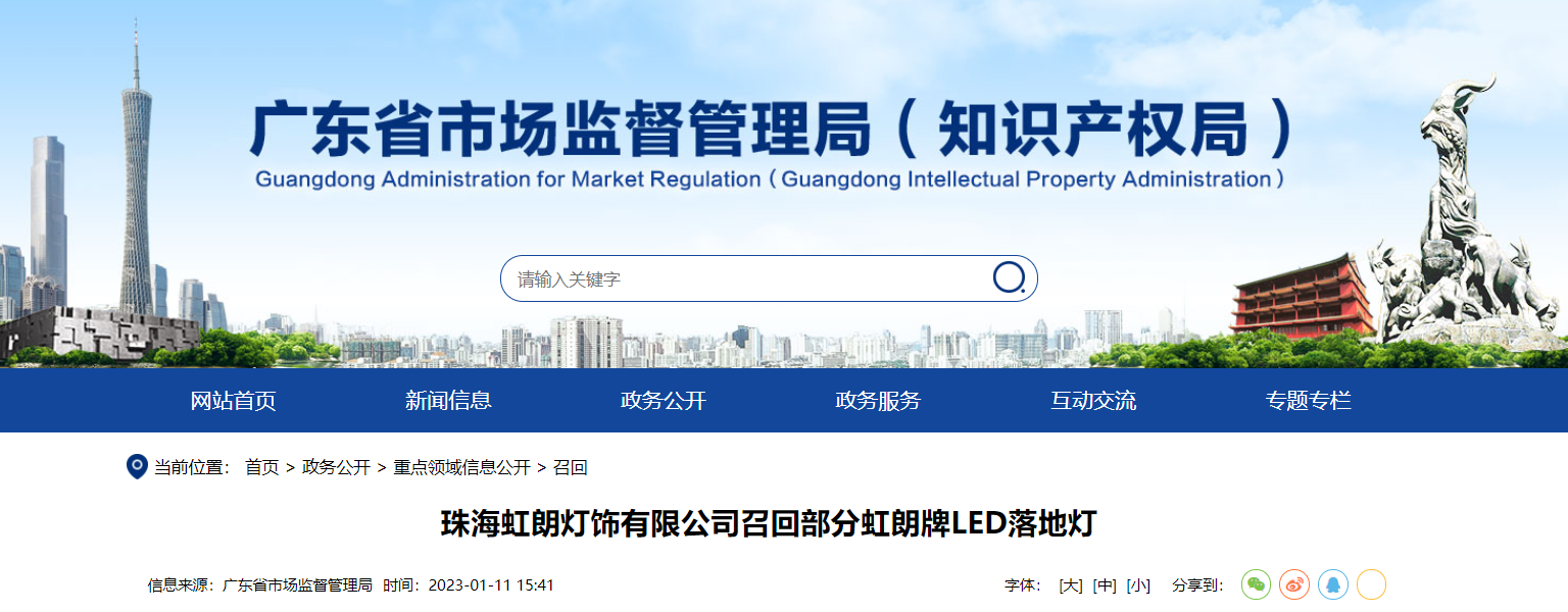 導讀:  家電消費網1月12日訊 昨天,廣東省市場監管局網站發布消息,珠海虹朗燈飾有限公司按照《消費品召回管理暫行規定》的要求,主動向廣東省市場監督管理局報告了召回計劃,自即日起,召回2021年2月10日至2021