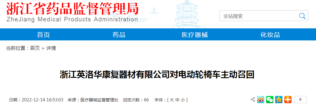家電消費網1月14日訊 昨天,浙江省藥品監督管理局網站發布消息稱,浙江英洛華康復器材有限公司召回其生產的9臺電動輪椅車N5516。