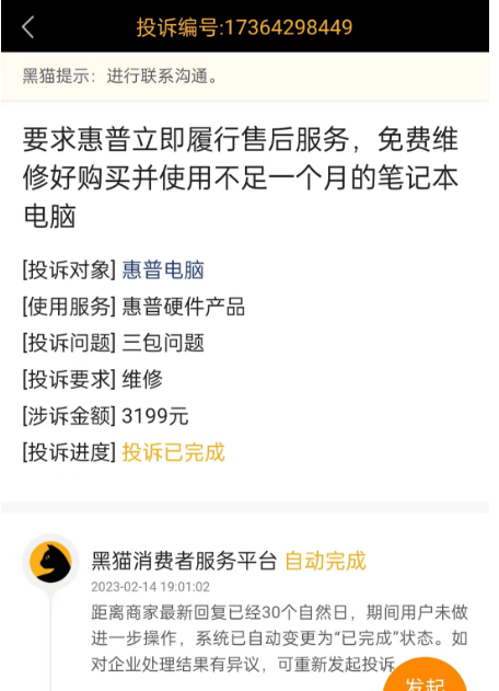 導讀: 家電消費網2月24日訊 昨天,廣東佛山消費者黃先生投訴稱,其在去年雙十二購買的惠普筆記本電腦使用一個月,就出現二次問題。 黃先生說,經過惠普官方的線下網點檢測后確認,系統有問題,需要重裝。 但惠