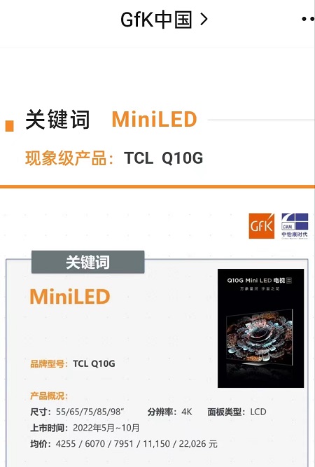 TCL Q10G入選GfK2022年彩電十大現(xiàn)象級產(chǎn)品