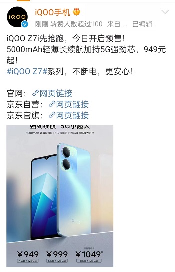 iQOO官微顯示,iQOO Z7系列有iQOO Z7、iQOO Z7i兩款產(chǎn)品。 售價有949、999、1049元。