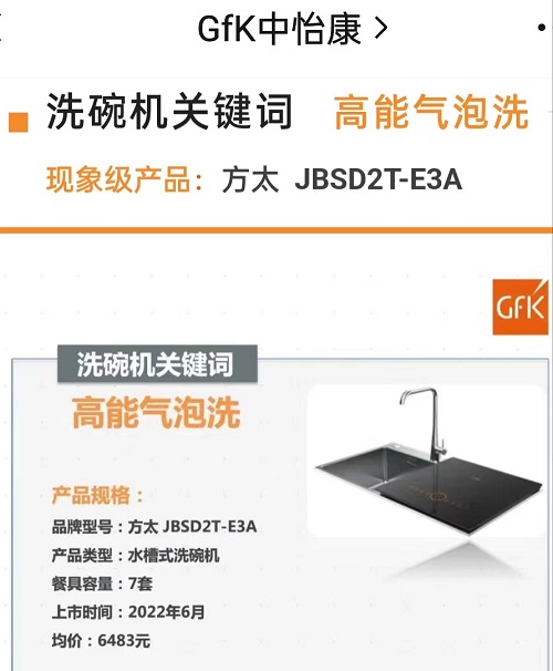 家電消費網3月22日訊 昨天,大數據公司GfK發布了2022年廚房電器品類十大現象級產品報告。該報告針對廚電市場主流品牌的暢銷產品型號進行特征總結,覆蓋“高效雙槍”、“5D環吸”、“全能艙”等熱點標簽。其中,方太JBSD2T-E3A水槽式洗碗機因“高能氣泡洗”的黑科技,成為其中的現象級產品。
