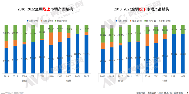 結(jié)構(gòu)方面,柜機結(jié)構(gòu)萎縮明顯,線上定頻掛機銷售升溫。其中,線上空調(diào)市場,變頻柜機占比由2021年的17.7%,下滑至2022年的14.9%,線下空調(diào)市場,變頻柜機也從2021年的17.7%萎縮至2022年的17.5%。