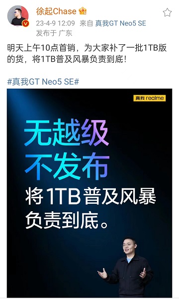 徐起:真我GT Neo5 SE明日開售 補貨1TB版