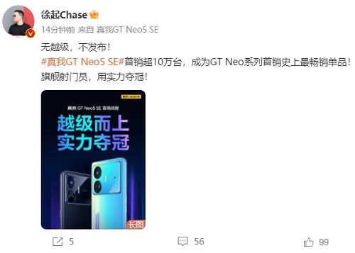 真我GT Neo5 SE首銷超10萬臺 徐起:實力奪冠