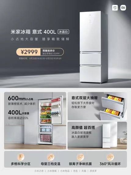 家電消費(fèi)網(wǎng)5月25日訊 今天,小米正式發(fā)布米家冰箱意式400L,售價2999元。