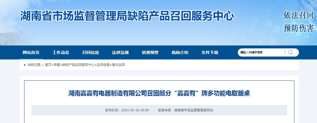 導讀: 家電消費網5月28日訊 昨天,湖南嘉嘉有電器制造有限公司主動向湖南省市場監督管理局報告了召回計劃,自即日起,召回2022年1月期間制造的嘉嘉有牌JJY-FZ109多功能電取暖桌,涉及數量為10臺。 據了解,本次