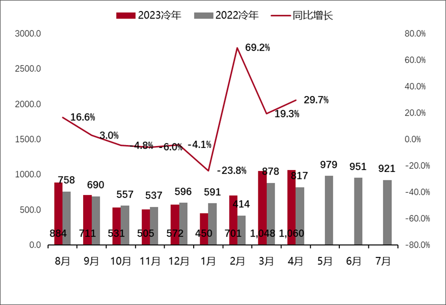 家電消費網6月7日訊 昨天,大數據公司產業在線發布的監測顯示,2023年4月家用空調生產1808.7萬臺,同比增長12.0%,銷售1791.0萬臺,同比增長13.3%,其中內銷出貨1059.7萬臺,同比增長29.7%,出口出貨731.3萬臺,同比下降4.3%。工業庫存1885.8萬臺,同比下降5.7%。