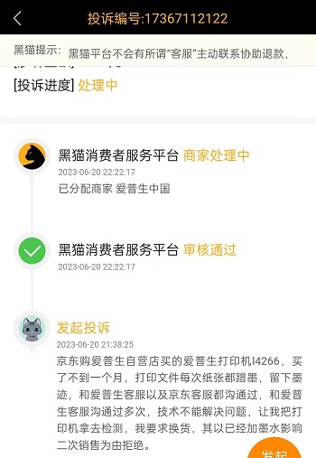 “我要求換貨,愛普生以已經加墨水影響二次銷售為由拒絕。”該消費者為此向黑貓投訴平臺進行投訴。