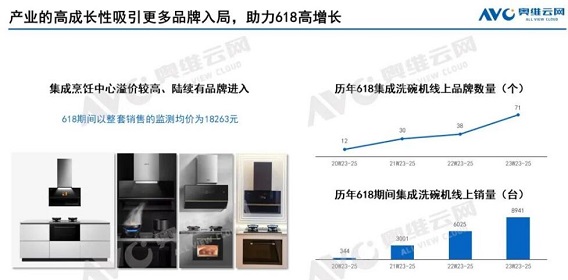 家電消費網6月27日訊 2023年618是疫情后的首個線上大促, 集成洗碗機、集成烹飪中心伴隨更多品牌的加入,再次迎來高增長。集成烹飪中心從1到1+N的品牌參與,且客單價保持高位,未來仍將持續火爆。集成洗碗機作為從集成烹飪到集成洗凈的延展,成為眾多集成灶垂直企業的新賽道。據奧維云網(AVC)線上監測數據顯示,2023年618期間(W23-25)集成洗碗機參與品牌增至71個,銷量也逼近萬臺。