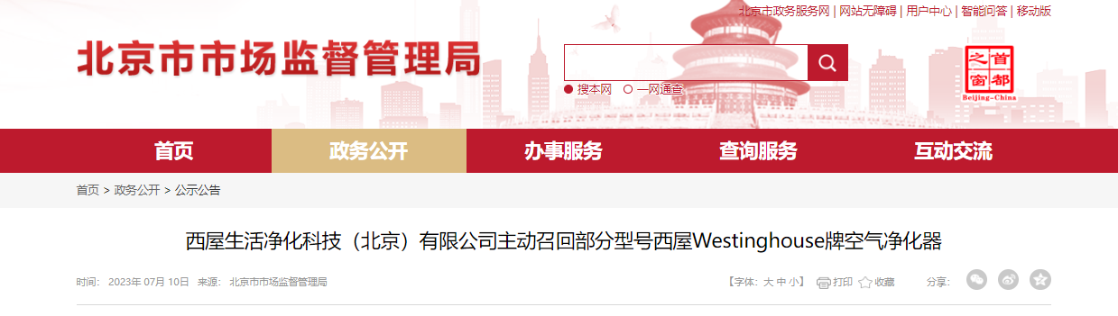 導(dǎo)讀: 家電消費(fèi)網(wǎng)7月13日訊 昨天,西屋生活凈化科技(北京)有限公司向北京市市場(chǎng)監(jiān)督管理局報(bào)告了召回計(jì)劃,主動(dòng)召回2022年6月1日至2022年12月31日生產(chǎn)的西屋Westinghouse牌空氣凈化器(型號(hào):AWT-5260W),涉及數(shù)量