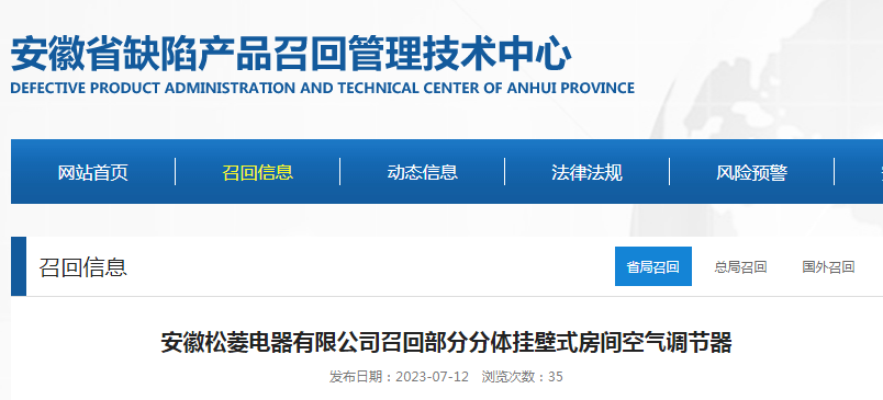 家電消費(fèi)網(wǎng)7月14日訊    昨天,安徽松菱電器有限公司向安徽省市場監(jiān)督管理局、淮北市市場監(jiān)督管理局備案了召回計(jì)劃,自即日起,召回2022年3月29日生產(chǎn)的天松牌分體掛壁式房間空氣調(diào)節(jié)器(房間空調(diào)器),規(guī)格:KF-26GW/B2-1SX(3),涉及產(chǎn)品共計(jì)22套。