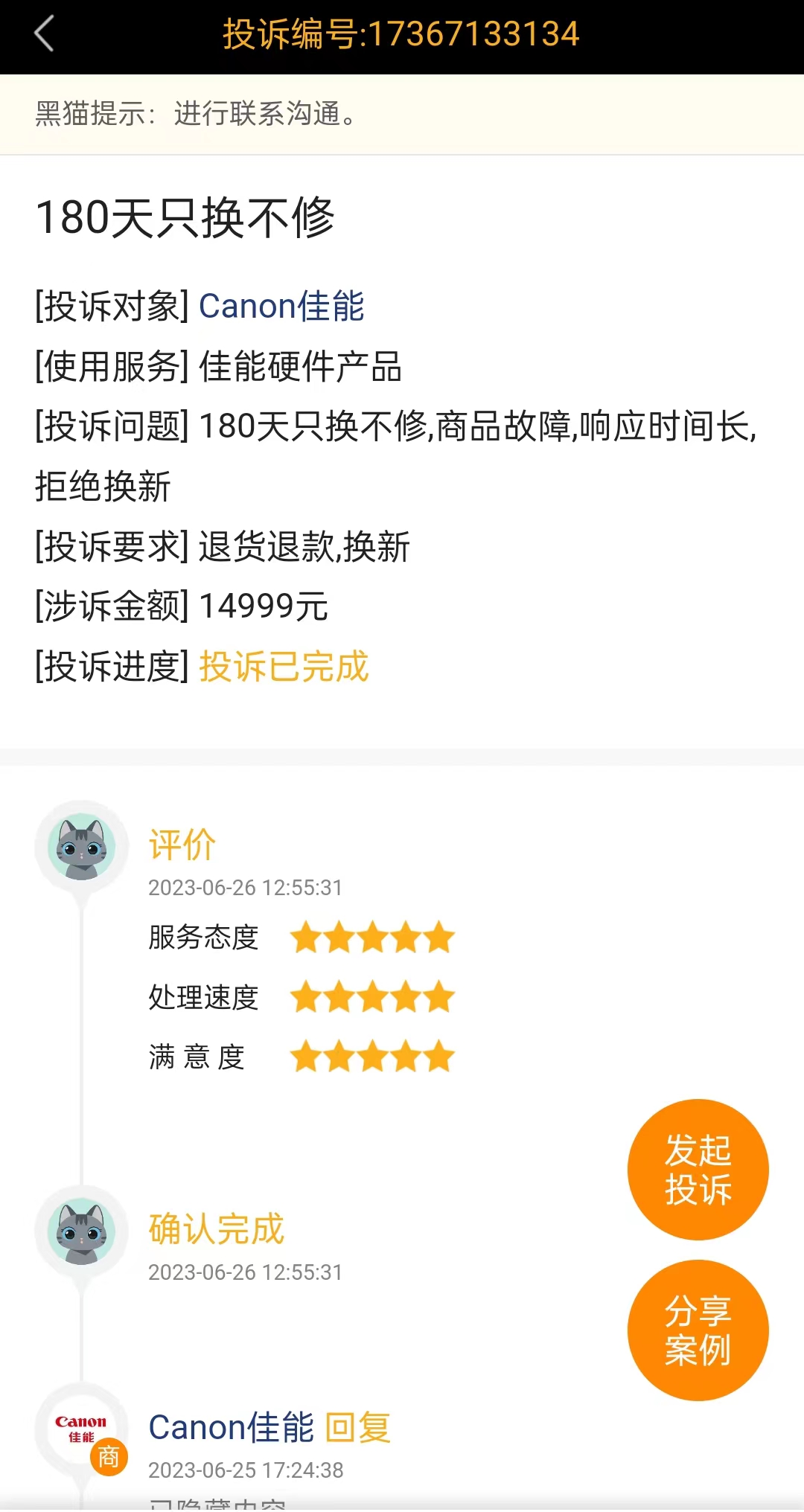 “佳能相機(jī)突然故障讓我對佳能的質(zhì)量產(chǎn)品了懷疑,佳能居然還違背自己的承諾和服務(wù)。讓我感覺到消費(fèi)得不到保障,如果這些天還沒解決,我將請律師走法律訴訟進(jìn)行消費(fèi)維權(quán)。”該消費(fèi)者向消費(fèi)維權(quán)投訴平臺黑貓投訴進(jìn)行了投訴。