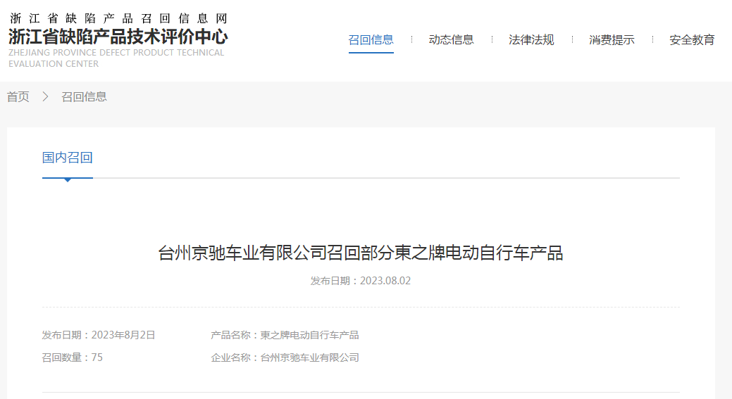 京馳車業(yè)召回75輛東之牌電動(dòng)自行車 存過(guò)熱起火隱患