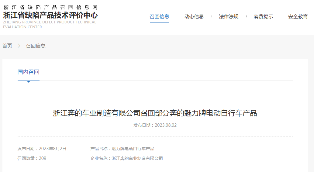 導讀: 家電消費網8月7日訊 昨天,浙江奔的車業制造有限公司主動向浙江省市場監督管理局報告了召回計劃,自即日起,召回2021年04月09日至2022年04月27日期間制造的電動自行車產品(型號TDT531Z),涉及數量為209輛