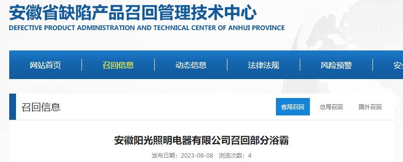 家電消費(fèi)網(wǎng)8月9日訊 昨天,安徽陽光照明電器有限公司向安徽省市場監(jiān)督管理局、六安市市場監(jiān)督管理局備案了召回計(jì)劃,自即日起,召回2022年6月26日生產(chǎn)的浴霸(規(guī)格:YQ4318-16),涉及數(shù)量為10臺(tái)。