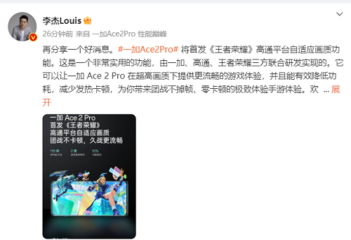 一加李杰:一加Ace2Pro將首發高通平臺自適應畫質功能 玩《王者榮耀》不掉幀零卡頓