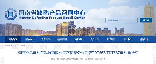 導讀: 家電消費網8月22日訊 昨天,河南立馬電動車科技有限公司主動向河南省市場監督管理局、駐馬店市市場監督管理局報告了召回計劃,自即日起,召回2022年8月2日制造的部分立馬牌電動自行車(型號 規格TDT55Z TD