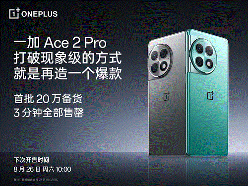 家電消費網8月23日訊 今天,一加 Ace 2 Pro 全渠道正式開售。首批 20 萬備貨 3 分鐘全部售罄,成為繼一加 Ace 2 后又一行業現象級爆款。