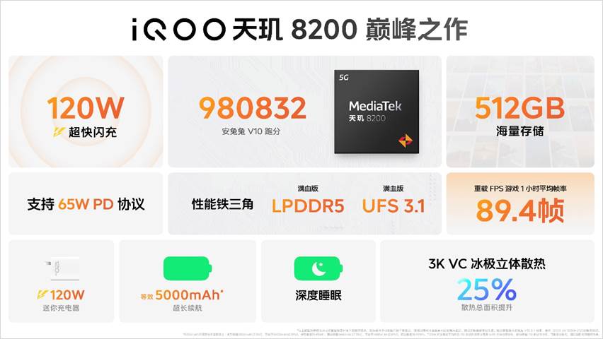 iQOO Z8搭載120W 超快閃充,至快10分鐘就能將內置超大電池充近一半,充電速度越級比肩行業旗艦,或將成為同價位中充電速度最快的產品。原裝充電頭還支持65W PD協議,配合原裝數據線,能夠為支持PD協議的多數耳機、平板、筆記本、手機進行快充,實力堪比“萬能充”。