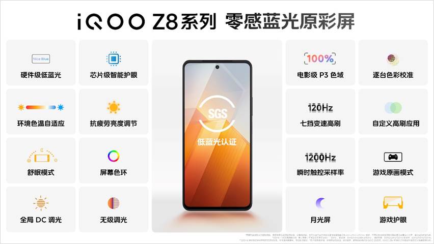 護眼好屏一直是Z系列拿手好戲,iQOO Z8配備零感藍光原彩屏,帶來具備芯片級智能護眼的硬件級低藍光,相同條件減少有害藍光50%,全系通過SGS低藍光認證;憑借前置色溫傳感器,支持屏幕色溫自適應,帶來真實、舒適觀感,其他還有抗疲勞亮度調節、舒適模式和游戲護眼功能,全方位護眼功能讓用戶雙眼得到精心呵護。